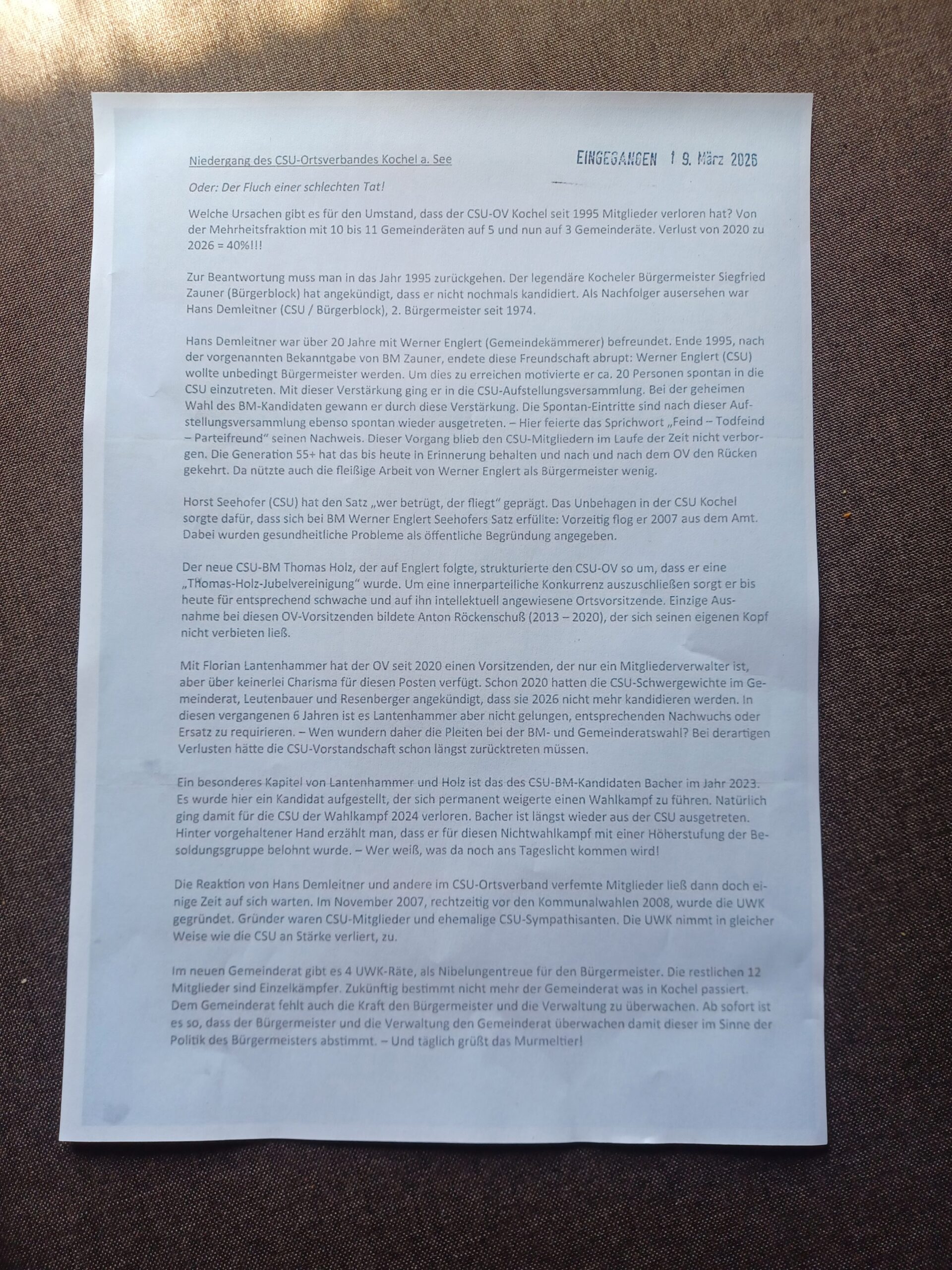Auf einer kompletten DIN A4 Seite wurde „per Post über Briefkasten“ eine Meinungsäußerung (nicht von mir!) öffentlich verteilt, die den „Niedergang des CSU-OV Kochel zum Zeitpunkt der erledigten Bürgermeisterwahl, aber vor der Stichwahl der beiden Landratskandidaten, beschreibt.